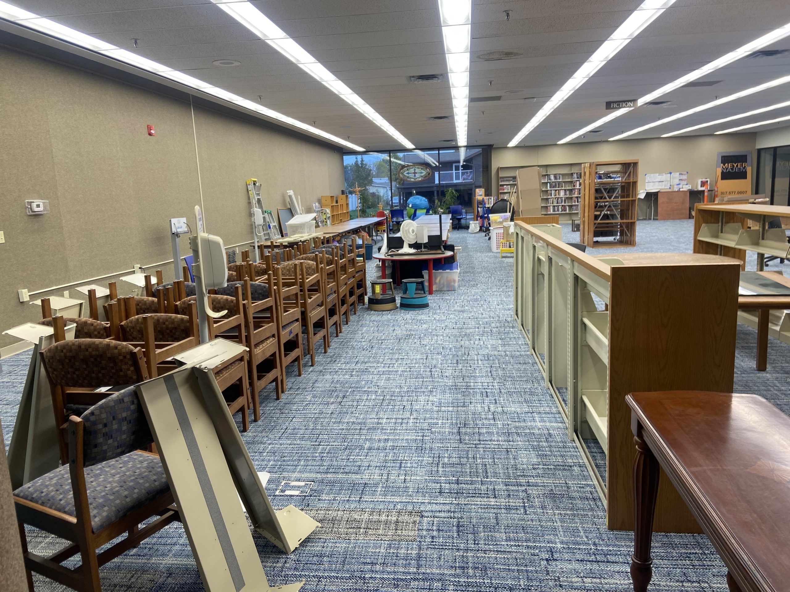 This week’s progress was all Children’s Department and we are loving it! The Children’s Program Room will be ready for our littles to create crafts and listen to stories before you know it! The updated fun blue-colored LVT (Luxury Vinyl Tile) is a great addition to the area. The storage area and staff work area lightened up with the addition of its own lightly colored LVT flooring. The main area is almost ready to move the shelves back in. The two carpeting choices in the Children’s Department are sure to get approval from our youngest patrons as they choose their next favorite read! What’s happening next? Stop by next Monday to find out!
