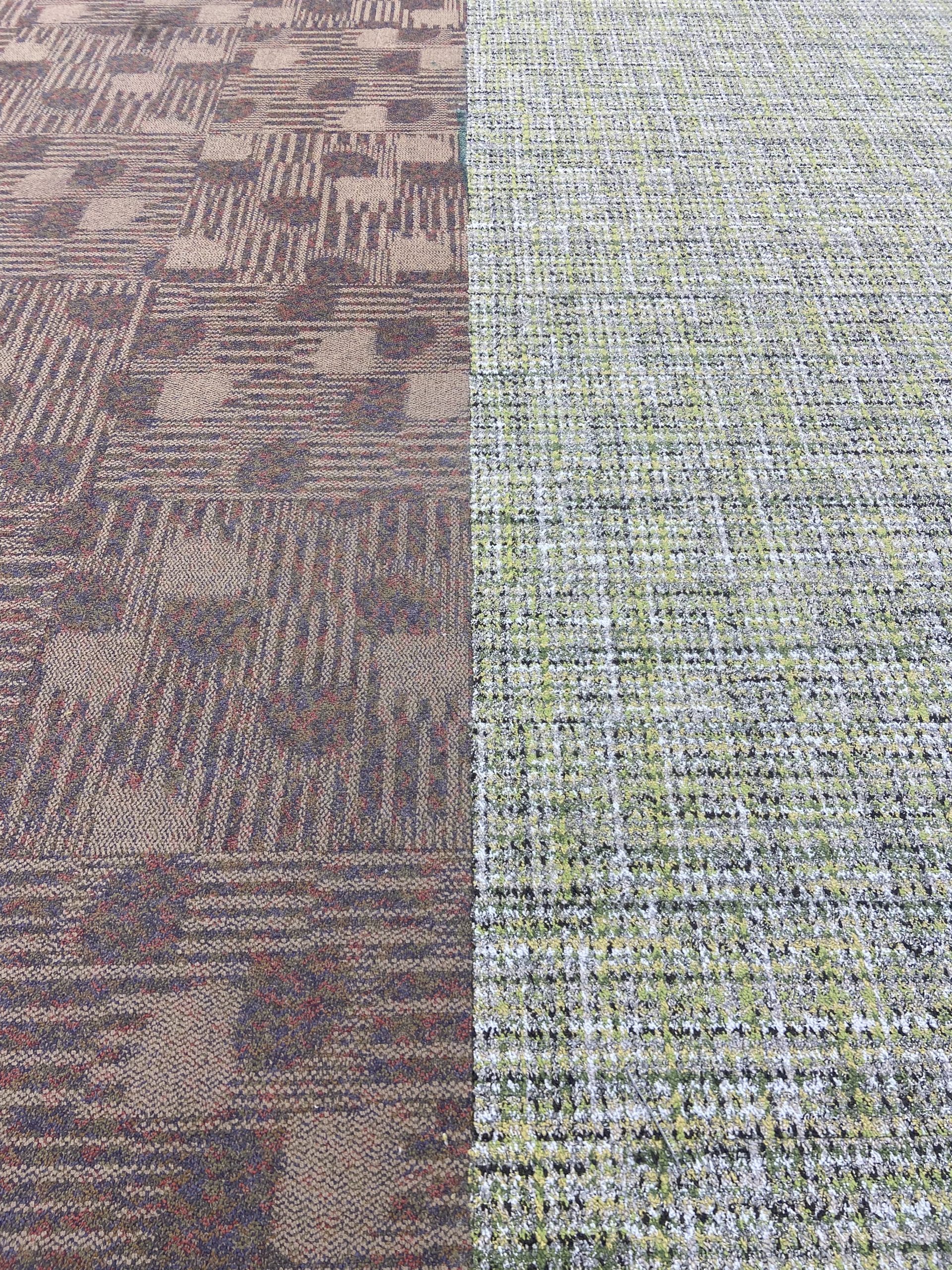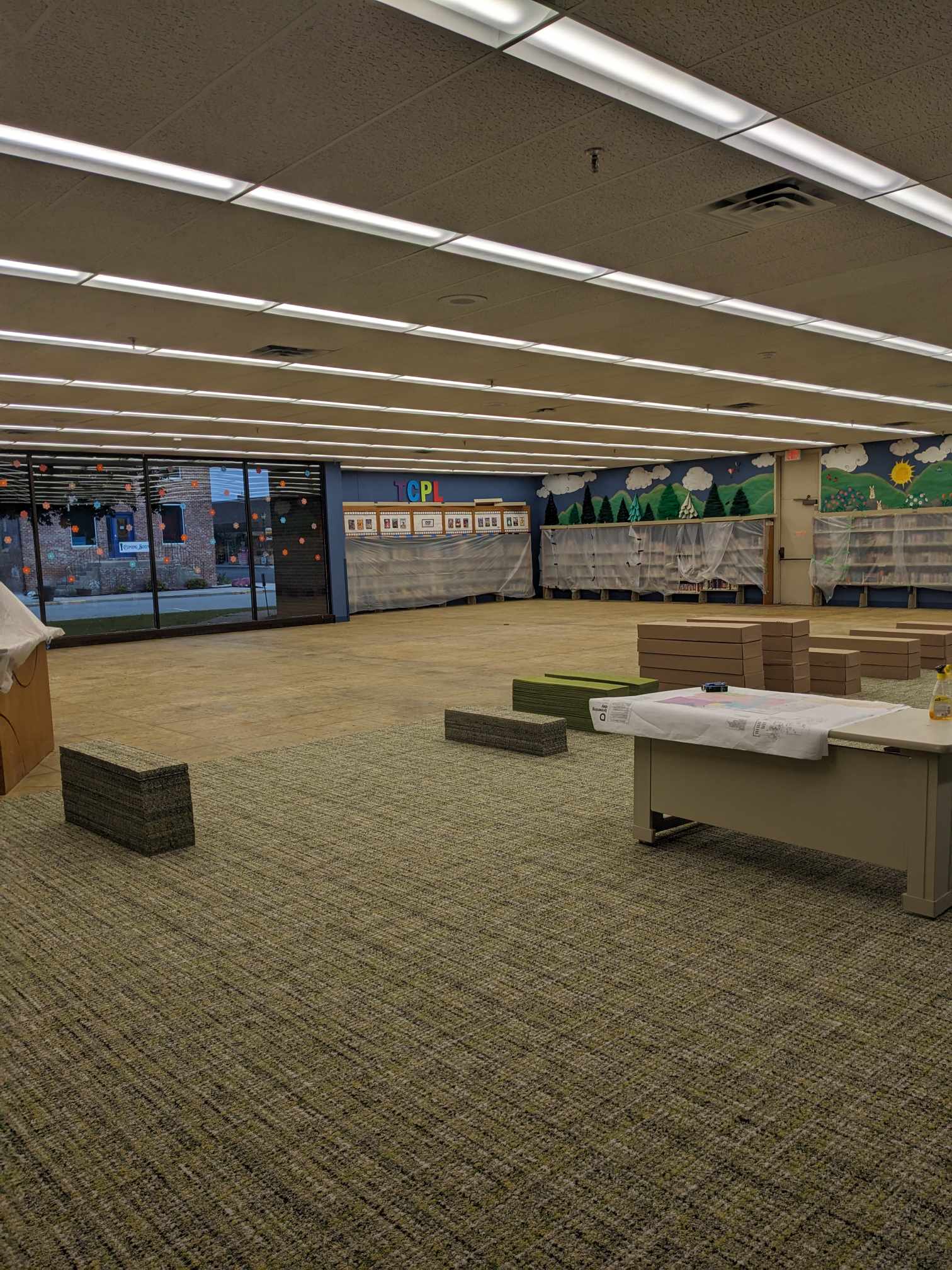 While the main part of the library is closed there has been a lot of action happening behind the blacked-out windows. Carpeting is in and the crew has been working hard at removing the old tan carpeting to get ready for the installation of the new carpeting that will provide a fresh look in the library. Check out the small section of blue that was put in late in the week! What a difference the carpeting will make in our space.
